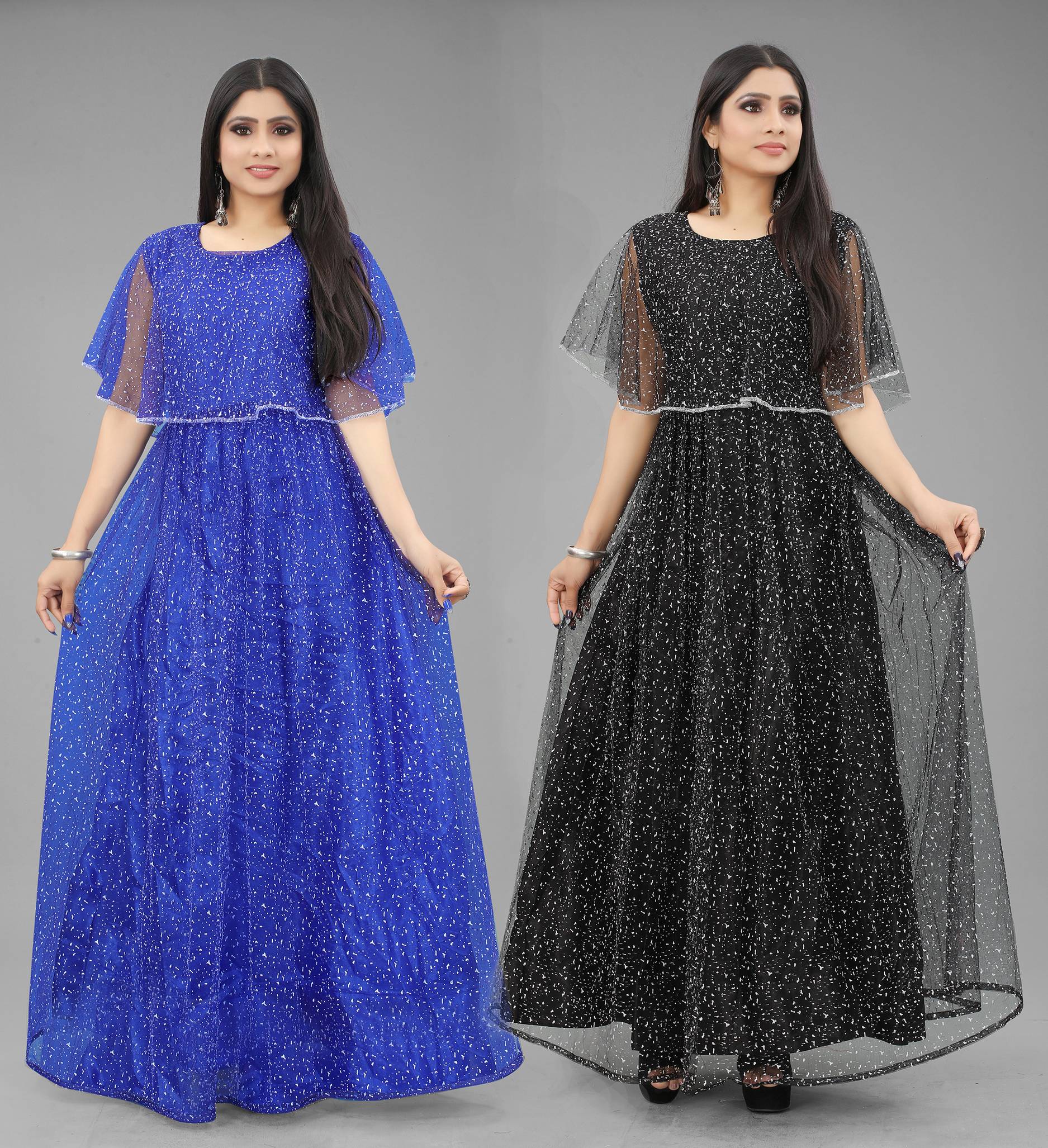 Gown Fabric : Net and Raw Silk, Gown Color : Black and Blue, Gown Work : Embellished, Size Guide : Free Size Fits Upto bust 44 Inch, Gown Sleeves Style : Sleeveles, Occasion : Party Wear,Wedding wear, Festival Wear, Stitching Type : Semi-Stitched, Stitching Type : Semi-Stitched