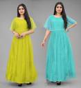 DECOFIN Self Design, Embellished Net Semi Stitched Flared/A-line Gown (Yellow, Light Blue)