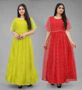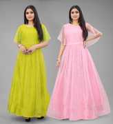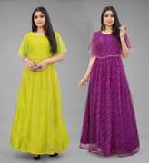DECOFIN Self Design, Embellished Net Semi Stitched Flared/A-line Gown (Yellow, Purple)