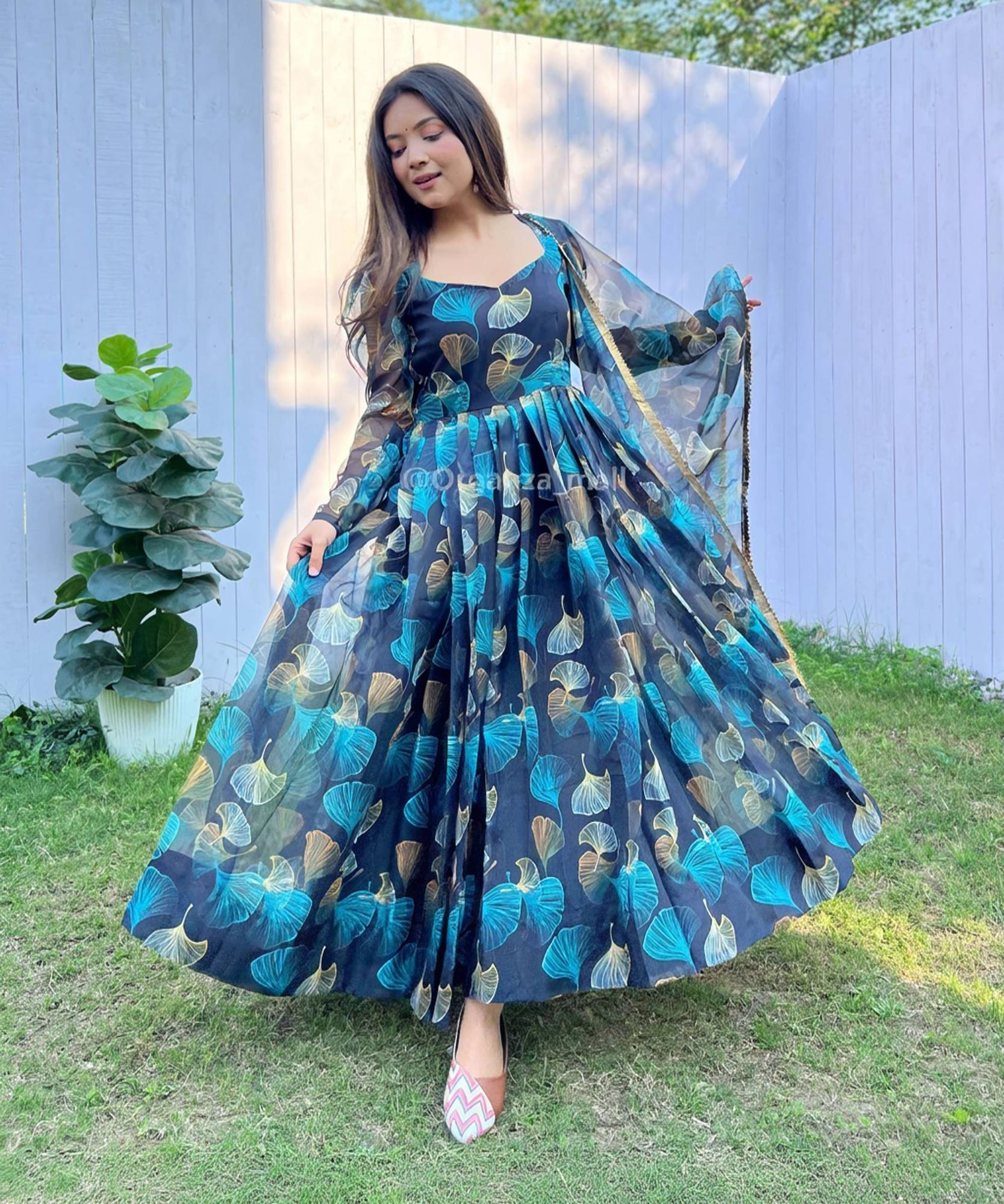 Gown Fabric : Net and Raw Silk, Gown Color : Black and Blue, Gown Work : Embellished, Size Guide : Free Size Fits Upto bust 44 Inch, Gown Sleeves Style : Sleeveles, Occasion : Party Wear,Wedding wear, Festival Wear, Stitching Type : Semi-Stitched, Stitching Type : Semi-Stitched