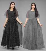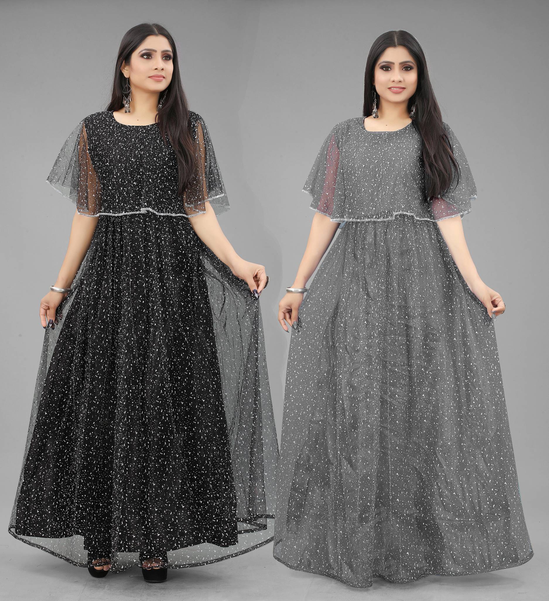 Gown Fabric : Net and Raw Silk, Gown Color : Black and Grey, Gown Neck Style : Round Neck, Gown Work : Embellished, Size Guide : Free Size Fits Upto bust 44 Inch, Gown Sleeves Style : Sleeveless, Occasion : Party Wear,Wedding wear, Festival Wear, Stitching Type : Semi-Stitched, Season Type : Suitable For All Season
