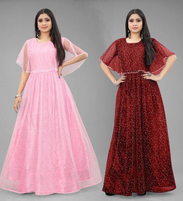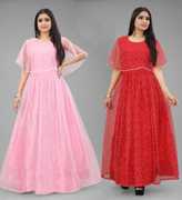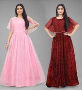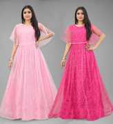 DECOFIN Self Design, Embellished Net Semi Stitched Flared/A-line Gown (Pink, Maroon)