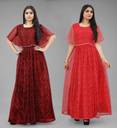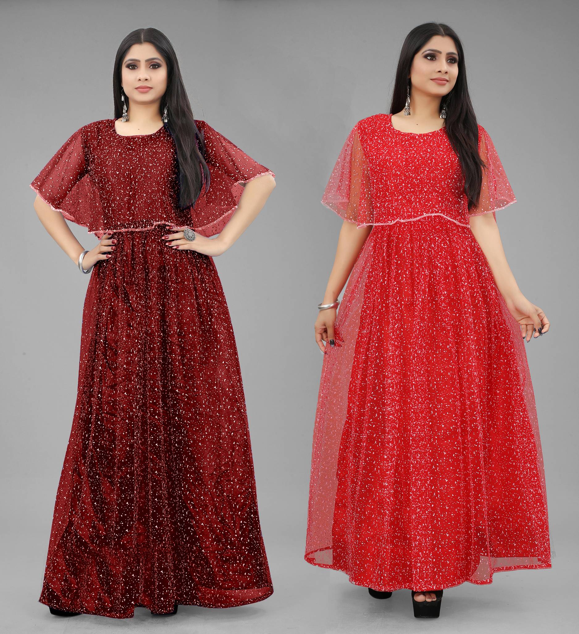 Gown Fabric : Net and Raw Silk, Gown Color : Maroon and Red, Gown Neck Style : Round Neck, Gown Neck Style : Round Neck, Size Guide : Free Size Fits Upto bust 44 Inch, Gown Sleeves Style : Sleeveles, Occasion : Party Wear,Wedding wear, Festival Wear, Stitching Type : Semi-Stitched, Season Type : Suitable For All Season