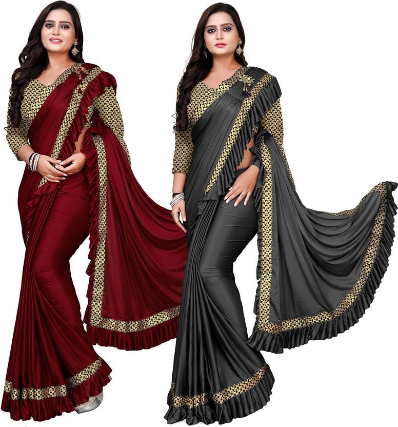 DECOFIN Woven, Solid/Plain Bollywood Lycra Blend Saree (Pack of 2, Red, Grey)