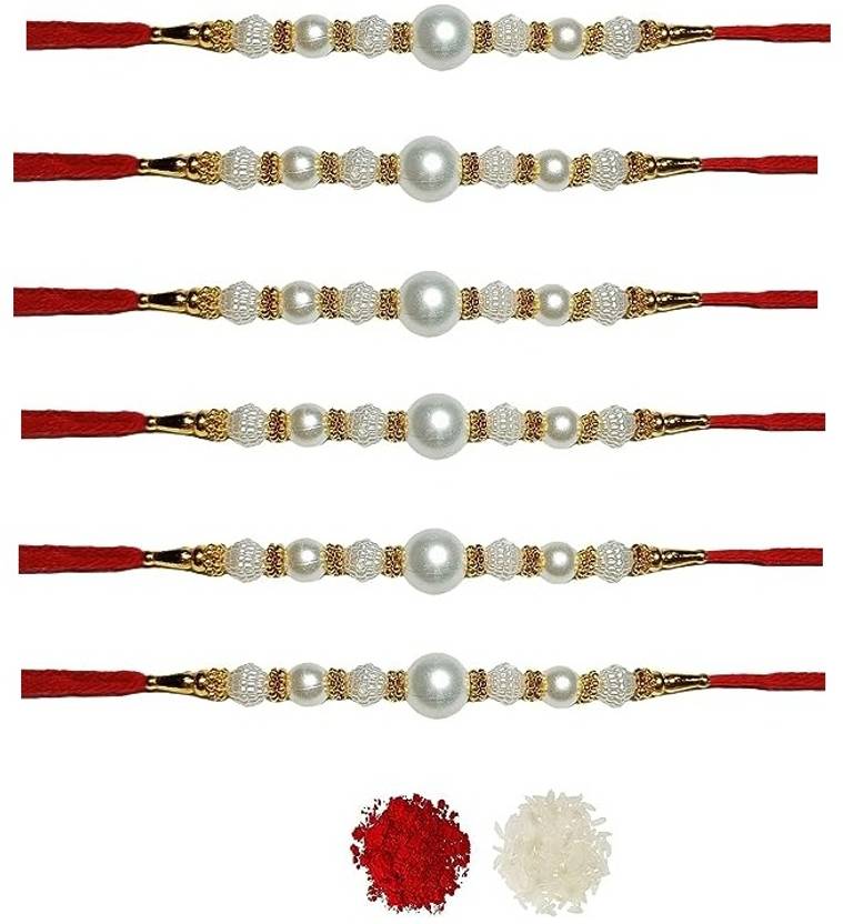 DEEPTI DECOR Set Of 6 White Beads Moli Thread Kalava Rakhi For Brother Rakhi Combo Rakhi For Bhaiya, Rakhi Gift For Brother 12 Similar Rakhi Set For Men Rakhi, Moli Rakhi Rudraksha Rakhi