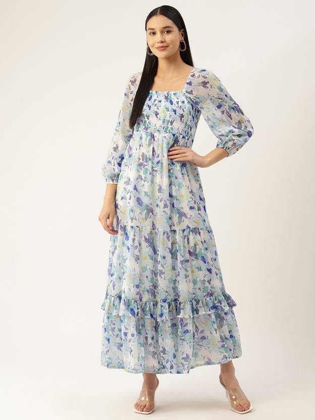 Women Fit and Flare Blue, Light Green, White Maxi/Full Length Dress