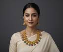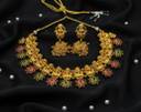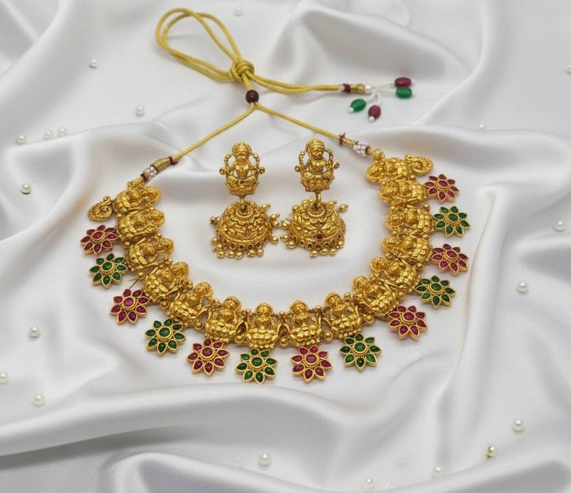 This is an exquisite gold-plated choker necklace and matching jhumka earrings set, showcasing a harmonious blend of traditional and floral designs. The choker features a series of delicate Goddess Lakshmi motifs, each interspersed with vibrant ruby-red and emerald-green floral elements. The matching jhumka earrings echo the Lakshmi design and fine craftsmanship of the necklace. The entire set is enhanced with a rich antique gold finish and subtle white pearl beads scattered across the white satin background, adding to its luxurious appeal.
