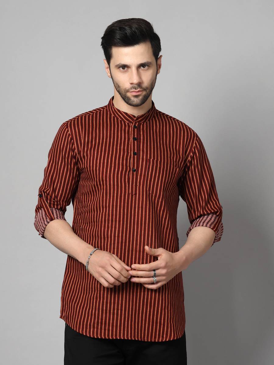 After Garnering Huge Success and remaining one of the Top Fabricators for Traditional Indian wear across South East Asia, brand "Vastraa Fusion" brings you another fresh range of Mens Short Kurta available in various Color and Size options, made from Pure Cotton fabric is perfect for layering and delivering a traditional look. This regular fit short kurta for mens features chinese collar with a button-down neckline. This full-sleeved men's ethnic kurta is handloomed in the rich Cotton that gives it smooth texture and makes it very comfortable to wear. Soft at skin, it keeps you cool - adding charm to your macho personality. Promising a long term endurance, this is a must have traditional attire for all men. Wear it with Jeans or Pajama and get ready for parties, weddings, functions, engagements, pre-wedding ceremonies of your friends and cousins, festivals and all such celebratory occasions. Complement it with a pair of kolhapuri chappals for fetching loads of compliments for your suave sense of fashion.