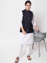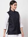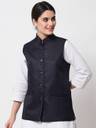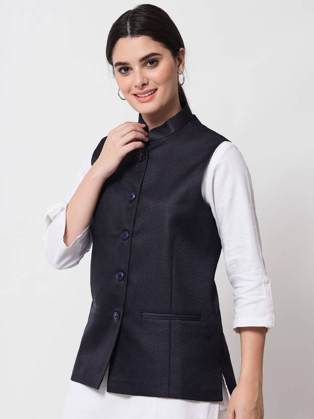 Nehru Jackets enhance the look for all occasions! Be it get-together, weddings, party, dinner dates or a casual met up, dress up in these precisely crafted jackets that come in a mix of royal colours, finest fabric, Well fitted and elegant. Paired with Kurta, suit or Formal Trousers. This Women Nehru jacket Featuring contrasting buttons on the placket, welt pockets and a simplistic design.