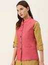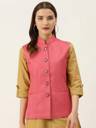 Nehru Jackets enhance the look for all occasions! Be it get-together, weddings, party, dinner dates or a casual met up, dress up in these precisely crafted jackets that come in a mix of royal colours, finest fabric, Well fitted and elegant. Paired with Kurta, suit or Formal Trousers. This Women Nehru jacket Featuring contrasting buttons on the placket, welt pockets and a simplistic design.
