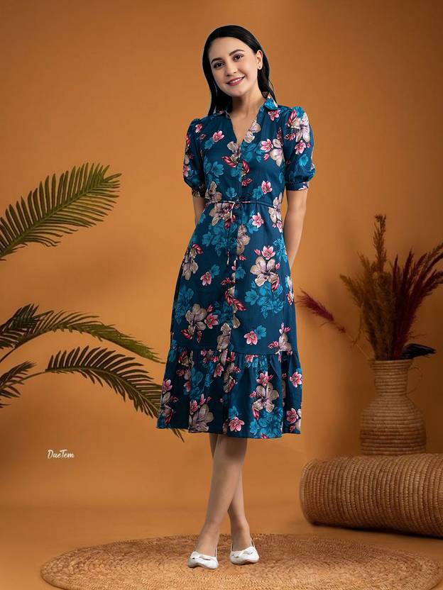 Deklook Women Fit and Flare Blue Knee Length Dress