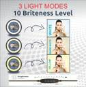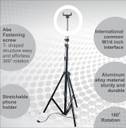 Camera stand with Ring Fill light holder with 10 inch outer diameter, medium size with powerful lighting. Comes with ball head mount for tripod and cell phone holder, easy to install and use on tripod, lighting for phone photography or live video. After installed on the ball head mount adapter, the ring light can be rotate 360 degree to any angle that you need or turn it from horizontal to vertical orientation Multifunctional ring light not only can be used as photography or live video light, but also suitable for makeup, reading, indoor and outdoor lighting. with USB port, this ring light is easy for powered by wall charger, computer or power bank White light, warm white light, warm yellow light three color modes, each light color has 7 levels of brightness to adjust to meet the lighting needs for taking photos, videos or makeup, reading books in different environments Professional photography ring light, It comes with the Tripod which can be extended up to 7 feet (84 cm) , which helps you perfect lighting at your face.