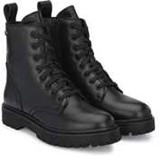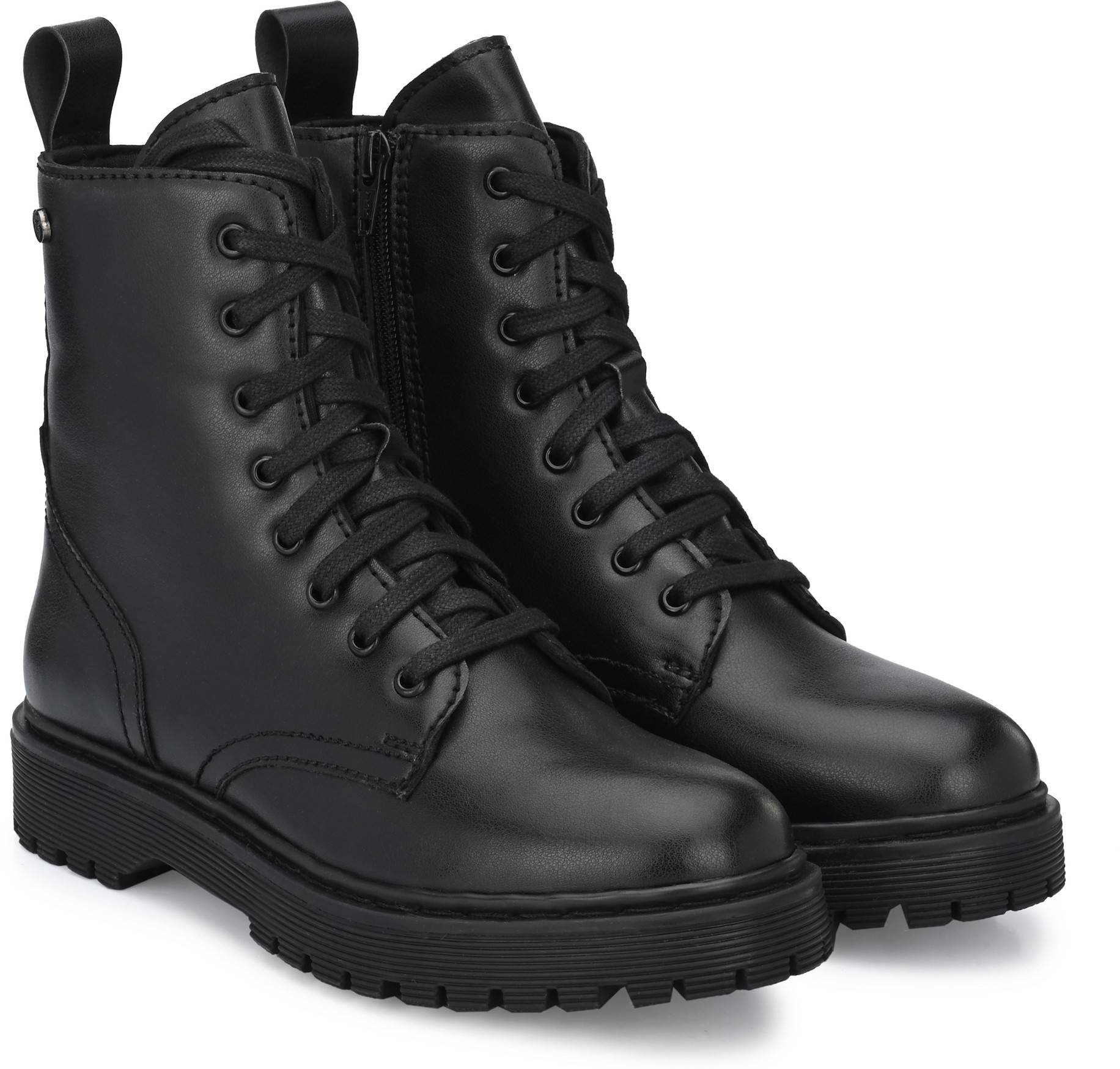 Black women’s vegan leather derby ankle boots with track outsole and back loop detail. Eight ilet facing. Inside zip to wear easily. Fabric lining and memory foam insock for ultimate comfort.