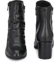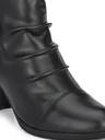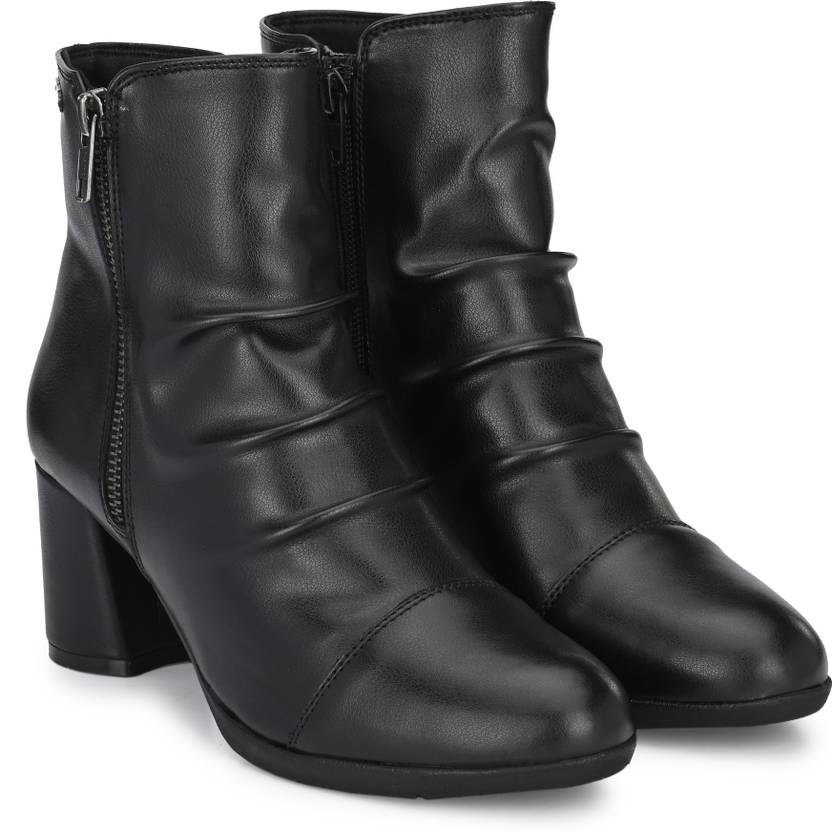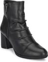 Black women vegan leather mid heel ankle boots with gathers and outside gunmetal zip. Inside zip to wear easily. Fabric lining and memory foam insock for ultimate comfort.