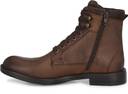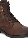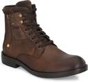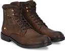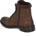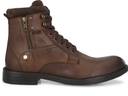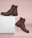 Brown men waxy Italian leather derby boots with contrast suede leather collar and tongue. Has outside brass zip and rivet detail. Five eyelets and two hooks facing. Inside zip to wear easily. Fabric lining and memory foam insock for ultimate comfort.