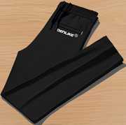 These comfortable black track pants feature a drawstring waist for an adjustable fit and practical side pockets. Designed for casual wear, sports, or lounging, they offer both style and functionality. The track pants are adorned with a brand logo, adding a touch of identity. They are versatile and can be paired with a variety of casual tops and footwear. Compatible products include: T-shirts, Hoodies, Sweatshirts, Sports shoes, Casual sneakers, Tank tops, Polo shirts.