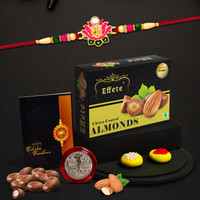 This rakhi set emphasises the importance of traditional rituals with a tilak set of roli and chawal and a pooja coin. This combination is an essential component of Raksha Bandhan and Bhai Dooj festivities for performing the tilak ceremony. Also, the pooja coin can be a significant element in many customs, bringing blessings of wealth and prosperity.