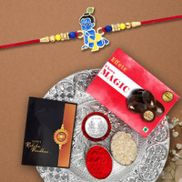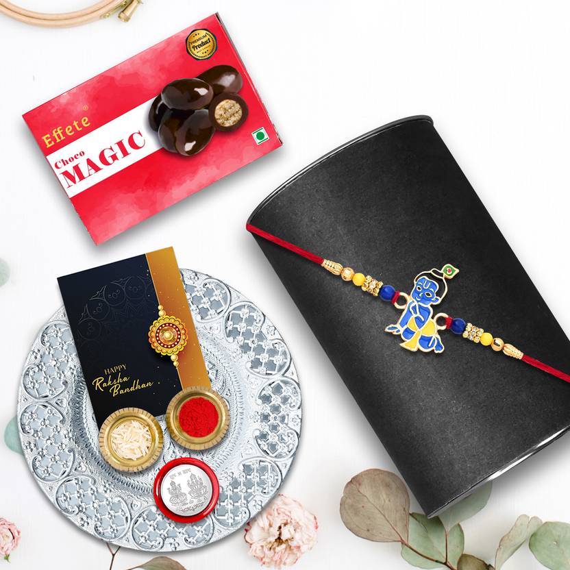 Owing to its complete package, this rakhi set offers a delightful assortment of essentials for Raksha Bandhan. With a Lord Krishna rakhi, roli chawal, coin, chocolates, and a greeting card included, this set provides everything you need to commemorate the occasion with love and reverence.