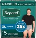 Help protect against bladder leaks with Depend Fresh Protection Incontinence Underwear for Men with Maximum Absorbency—for all day protection guaranteed*. Our adult diapers for men feature a super absorbent core that absorbs 25x** its weight, turns liquid into gel, and helps neutralize odors. Our technology also features a liner that helps keep you dry throughout the day by wicking wetness away from your skin. Comfortably live your life with men’s bladder leak protection that feature a discreet fit, soft and smooth fabric, and a high-performance waistband that helps keep the incontinence underwear securely in place. Find your fit with four sizes sizes—small/medium (26–34" waist), large (35–43" waist), extra-large (44–54" waist) and extra-extra-large (55–64" waist)—in a neutral grey color. Depend men’s incontinence underwear for bladder leaks is also HSA/FSA-eligible in the US. Also check out our Depend Night Defense Adult Incontinence Underwear for Men to help protect against nighttime bladder leaks! (*If you’re not completely satisfied with the fit of your Depend incontinence underwear, we can help.