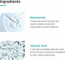 This anti-acne gel contains niacinamide and salicylic acid. Niacinamide helps to enhance the skin's barrier function, reduce excess sebum production, and improve skin texture and tone. Salicylic acid gently exfoliates dead skin cells and unclogs pores, reducing inflammation and preventing future breakouts. This oil-free gel is designed to address the specific needs of acne-prone skin without causing dryness or irritation, making it ideal for those with sensitive skin. It is also easy to use and can be incorporated into your daily skincare routine. This gel helps promote healthier, acne-free, and naturally radiant skin.