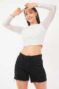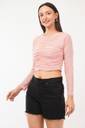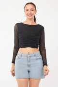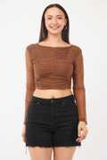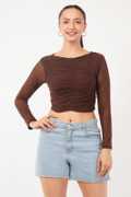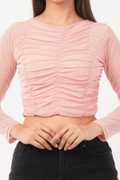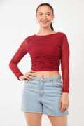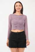 Turn up the charm with this stylish mesh crop top, perfect for making a statement while staying effortlessly cool. Designed with long sheer sleeves and a ruched front bodice, this top hugs the body beautifully while adding dynamic texture and a modern flair. The soft, stretchy fabric ensures comfort without compromising on style.