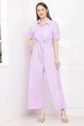 This vibrant mustard jumpsuit combines elegance and comfort for a chic, effortless look. The top features a collared shirt design with short, slightly puffed sleeves, giving it a smart, tailored appearance. The button-down front adds a classic touch, while the waist is defined by a fabric tie, accentuating the figure. The bottom half of the jumpsuit flows into wide-legged pants, offering ease of movement and a relaxed silhouette. The smocked detailing at the waist enhances the fit, making it both stylish and comfortable. Perfect for casual outings or semi-formal occasions, this jumpsuit blends sophistication with a bold color that stands out.