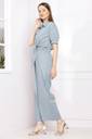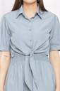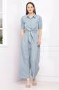 This vibrant mustard jumpsuit combines elegance and comfort for a chic, effortless look. The top features a collared shirt design with short, slightly puffed sleeves, giving it a smart, tailored appearance. The button-down front adds a classic touch, while the waist is defined by a fabric tie, accentuating the figure. The bottom half of the jumpsuit flows into wide-legged pants, offering ease of movement and a relaxed silhouette. The smocked detailing at the waist enhances the fit, making it both stylish and comfortable. Perfect for casual outings or semi-formal occasions, this jumpsuit blends sophistication with a bold color that stands out.