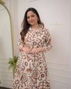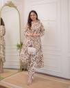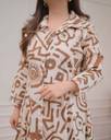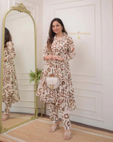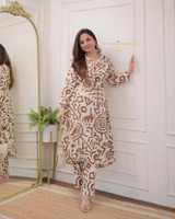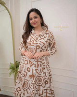 Featuring an abstract printed design in earthy tones, this women's kurta set captures attention with its bold yet refined look. Furthermore, the motifs add a contemporary flair, making the attire stand out with its artistic detailing. Additionally, the all-over print ensures consistency in design across the kurta and trousers. Plus, the balanced placement of the motifs lends a polished appeal.