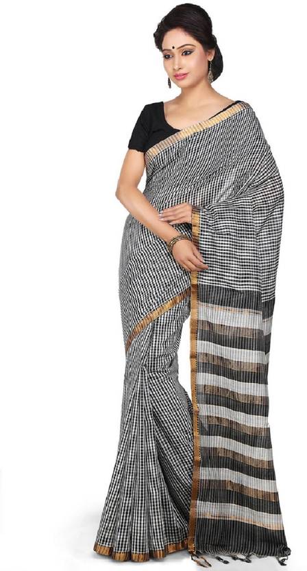 Checkered Mangalagiri Handloom Cotton Blend Saree (Black)