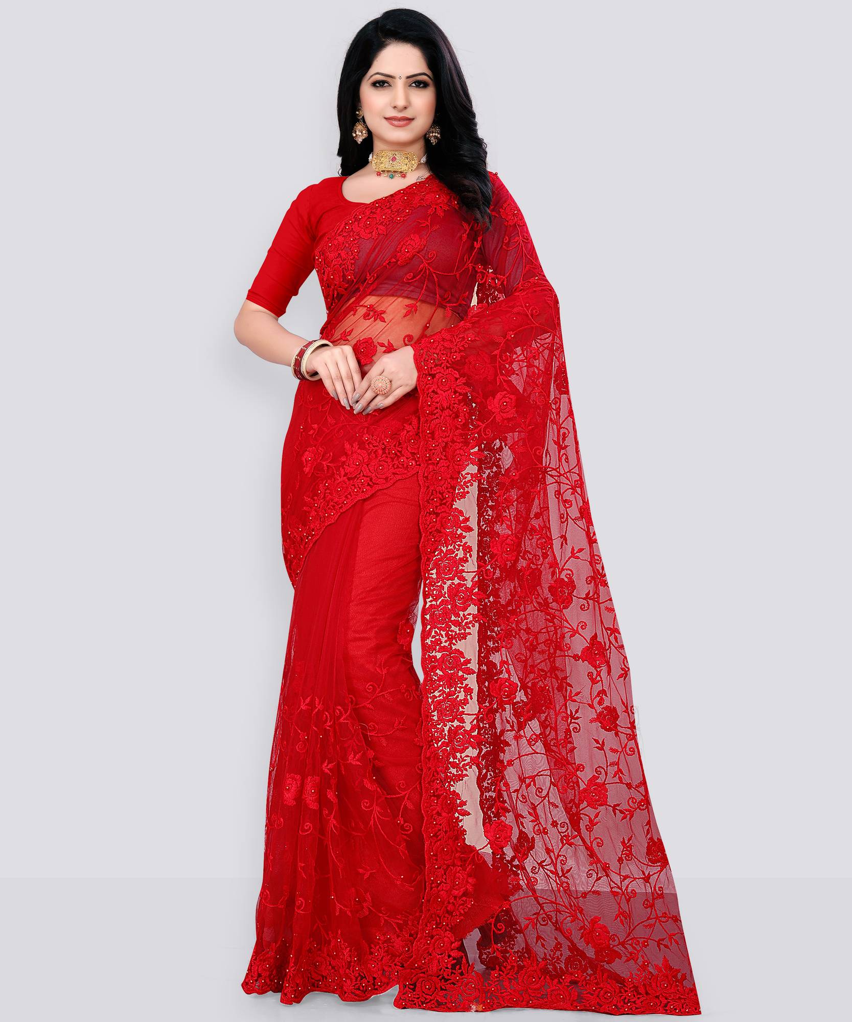 Net Embroidery Work Saree: A Saree Is The Epitome Of Grace And Poise, Going Back Generations And Still Stands As The Pride Of Traditional Indian Fashion. Pinned Back Or Draped Freely Around The Arm, There Is No Room For A Faux Pas. Saree Material: Net, Saree Length: 5.5 Meter Net Saree, Blouse Length: 0.80 Meter Silk Unstitch Blouse Piece Gives You The Liberty Of Getting Your Blouse Custom-Made. It Enables You to Be The Total Dive Flaunting Beautiful Colors. For Occasions: The Peppy And Elegant Design And All The Features Make This Saree Apt For Various Occasions. It Can Also Be Worn In All The Special Events To Get A Spectacular Appearance. Colors Care Instructions: Due To The High And Fragile Quality Of The Material, Dry Cleaning Is The Best Method To Take Care Of The Fabric. Especially In Cases Of Stains, Mix, And Match: You Can Pair A Saree With A Clutch And A Pair Of Fashion Sandals Or Any Casual Footwear Of Your Choice For A Casual Look When Dressing Up For A Party. You Can Also Pair It With A Pair Of Earrings And Bangles When Adorning This Outfit For A Festive Occasion.::Ideal Gift: This Brighten Red Color Gives a Great Look When Worn. It Can Be Gifted To Your Family Friends, Colleagues, Spouse Or Relatives They Will Surely Thank You For This Best Gift.