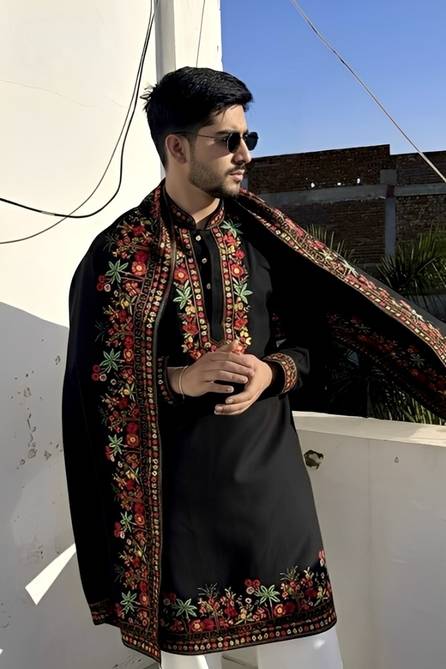 Elevate your ethnic style with this Dupion Silk Kurta and White pyjama set. Crafted from premium fabric, it offers a regal look with a refined finish. Perfect for festive occasions and celebrations.