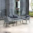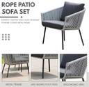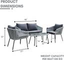 Create the perfect setting for relaxation, connection, and style with our 4-Piece Outdoor Patio Conversation Sofa Set, thoughtfully designed for modern comfort and all-season durability. This elegant grey set includes a two-seat sofa, two cozy armchairs, and a matching coffee table, ideal for patios, balconies, gardens, or poolside lounges. Crafted with a sturdy powder-coated metal frame and weather-resistant rope, this set is built to withstand sun, rain, and everyday wear keeping your outdoor space stylish and functional all year round. The soft, high-density seat and back cushions offer cloud-like comfort, making every gathering or quiet moment more enjoyable. The removable cushion covers are easy to clean, ensuring effortless maintenance and lasting beauty. The sleek coffee table with a glass top adds a modern touch while providing a stable, easy-to-clean surface for drinks, snacks, or décor. Whether you're hosting weekend get-togethers or enjoying a peaceful evening under the stars, this set delivers the perfect blend of comfort, versatility, and elegance.