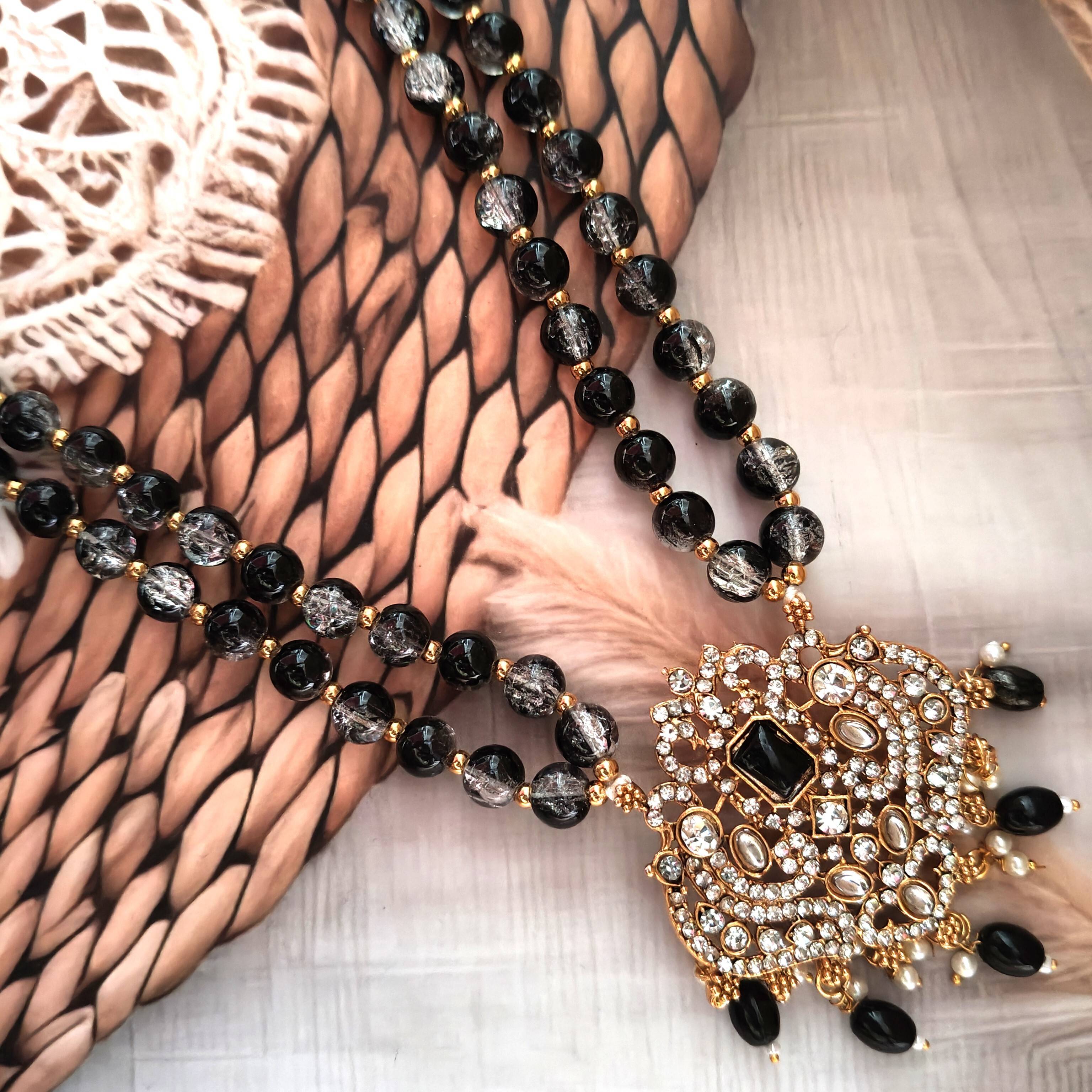 • The centerpiece is a short drop pendant of stacked black beads finished with a small silver spacer, adding refinement and length.