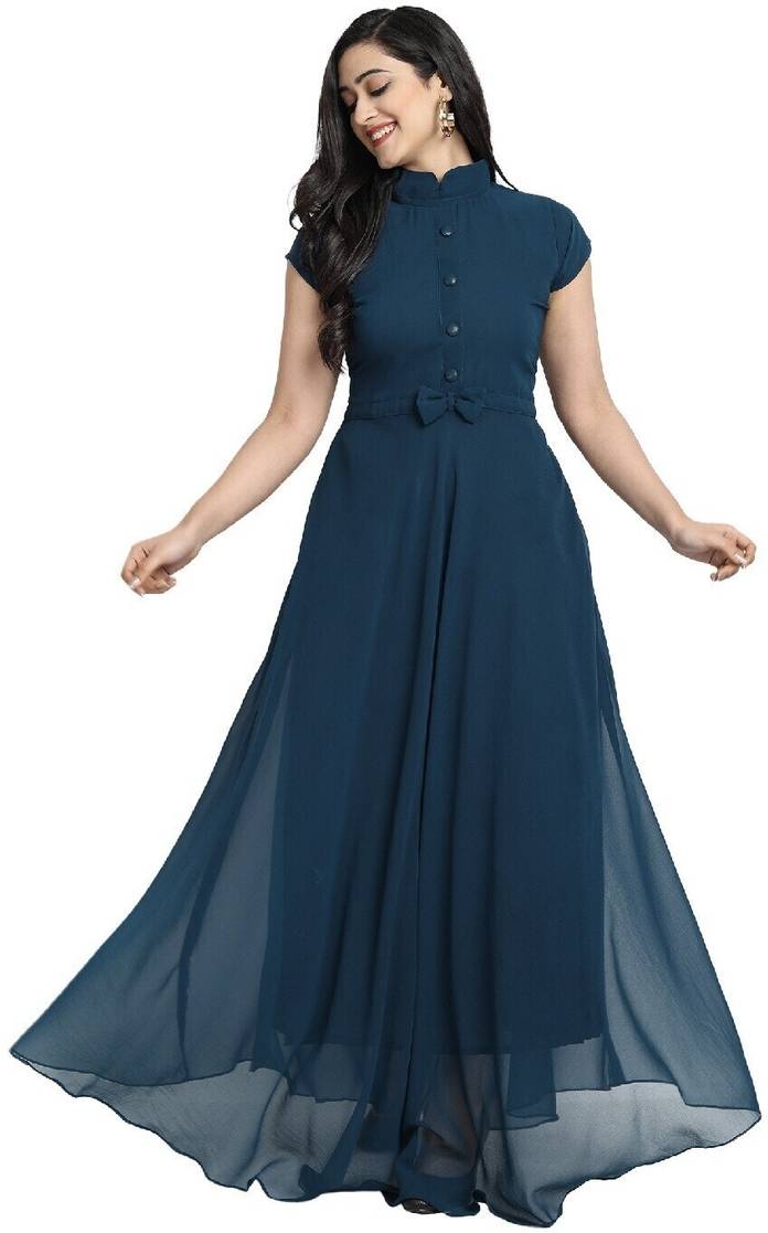 Solid Georgette Stitched Flared/A-line Gown (Blue)