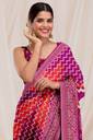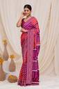 The description emphasizes the craftsmanship of the saree, noting its elegant design and the way it enhances the wearer's wardrobe. Whether paired with heels or flats, the bandhani style art silk saree is portrayed as a garment that exudes grace and sophistication.