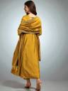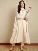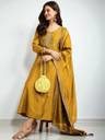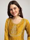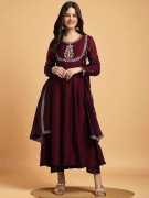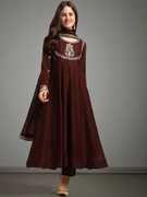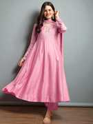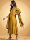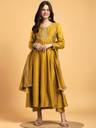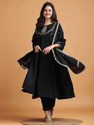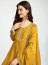 Enhance your festive wardrobe with this beautifully flared kurta set made from smooth Vichitra silk. The kurta features delicate embroidery around the neckline and sleeves, paired with straight-fit pants and a matching dupatta finished with tassel detailing. The soft texture and graceful flare make it a perfect choice for special occasions and traditional celebrations.