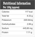 • CALORIES 117, TOTAL FAT 8.33g(12.81%), POTASSIUM 226.64 mg, SODIUM 445.80mg, (18.57%), TOTAL CARBO HYDRATE 2.89g (0.96%), PROTEEN 7.71 g PER 100g