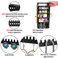 Thanks to a hanger mount design, this stand features multiple holes for earrings and ear studs, along with grooves for necklaces, chains, and bracelets. Also, the open structure ensures easy accessibility to all jewellery pieces, while the up to 360-degree rotational base allows a full view from all sides and angles. This ergonomic layout not only enhances the display of jewellery but also makes it convenient to store and retrieve pieces as needed.