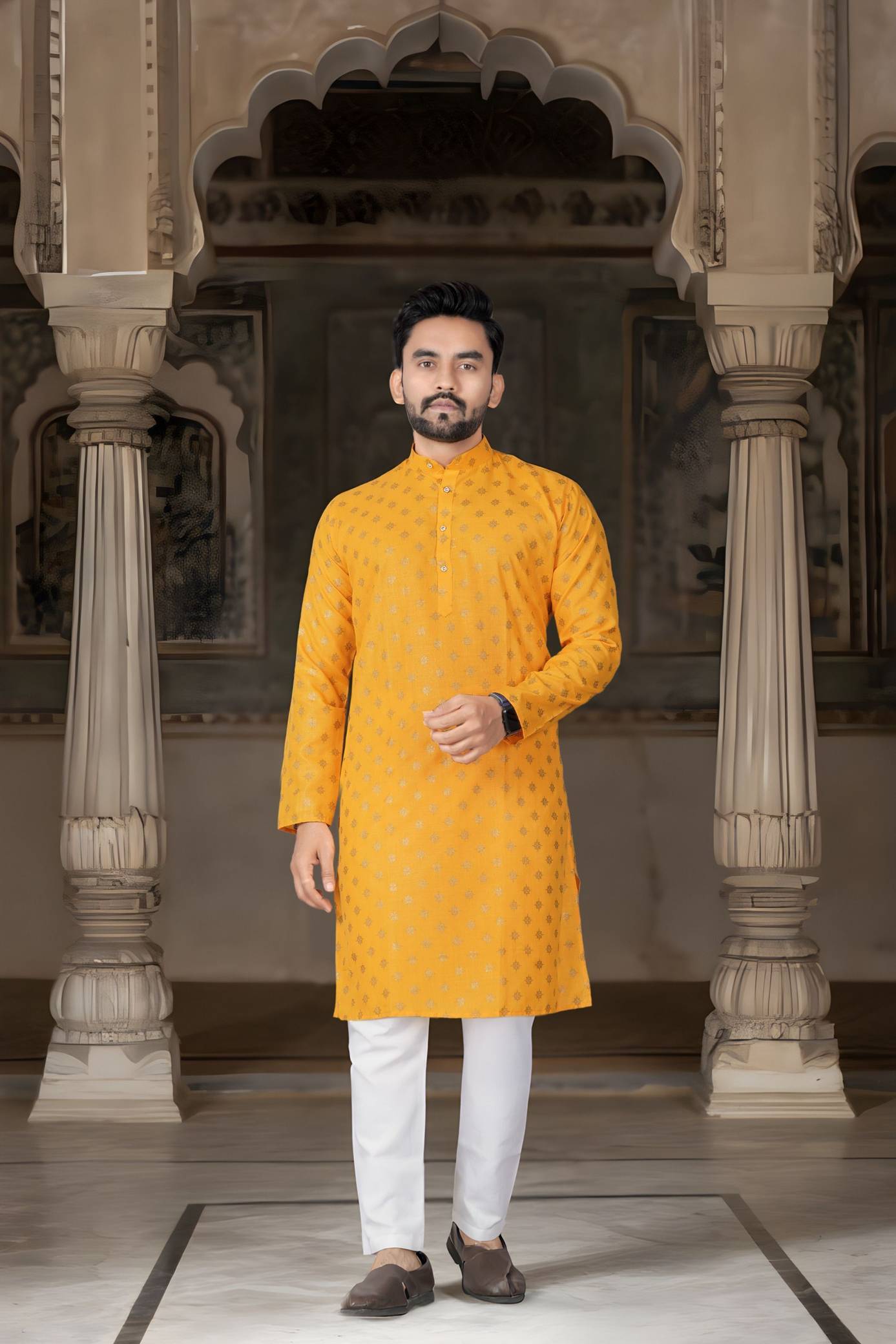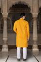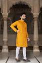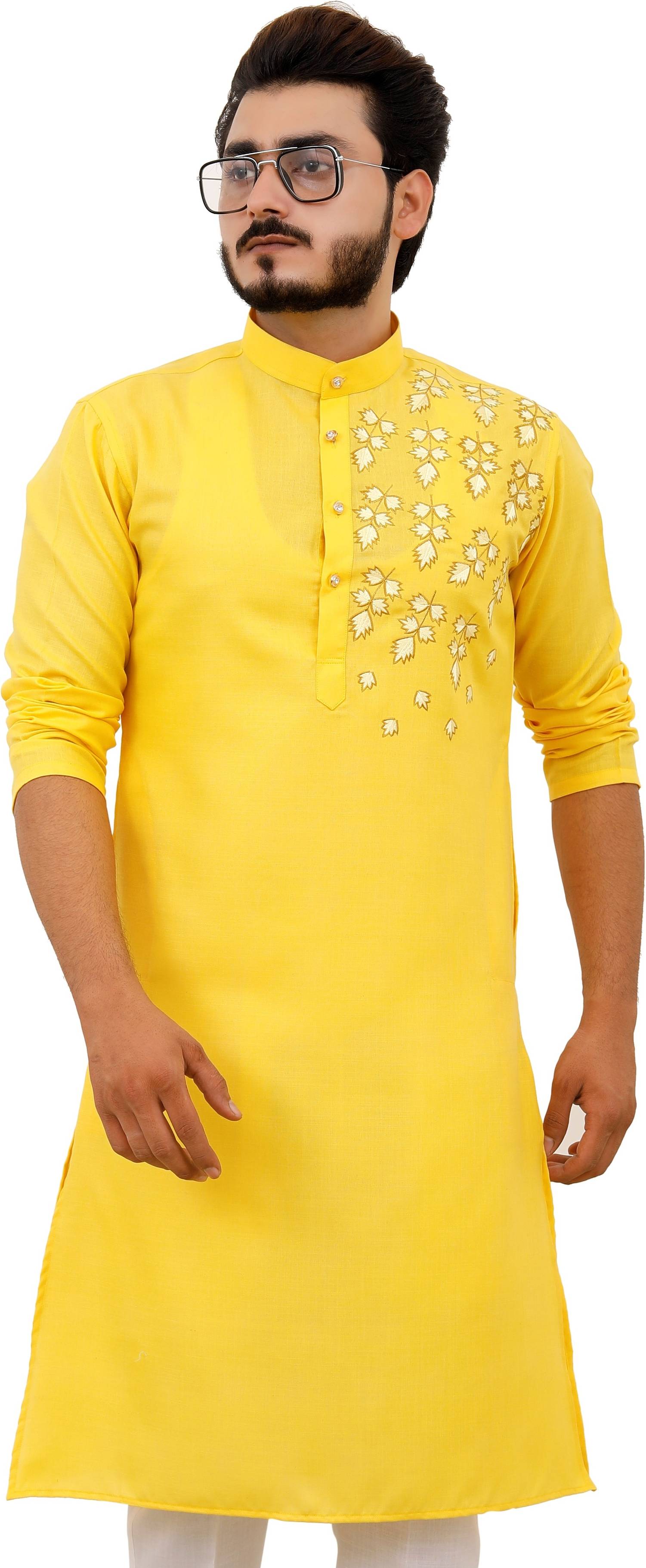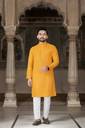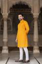 This kurta for men comes in a rich yellow & gold top paired with a classic white bottom, featuring an ethnic motif print that suits traditional occasions. Designed with a mandarin collar and regular full sleeves, this printed kurta for men is made from comfortable cotton blend fabric, making it suitable for long hours of wear. The set includes both kurta and pyjama, making it a complete kurta pajama for men and kurta set for men. Ideal as a kurta for men for wedding, kurta for men puja special, or party wear kurta for men, this wedding kurta for men offers a balanced blend of traditional style and everyday comfort.