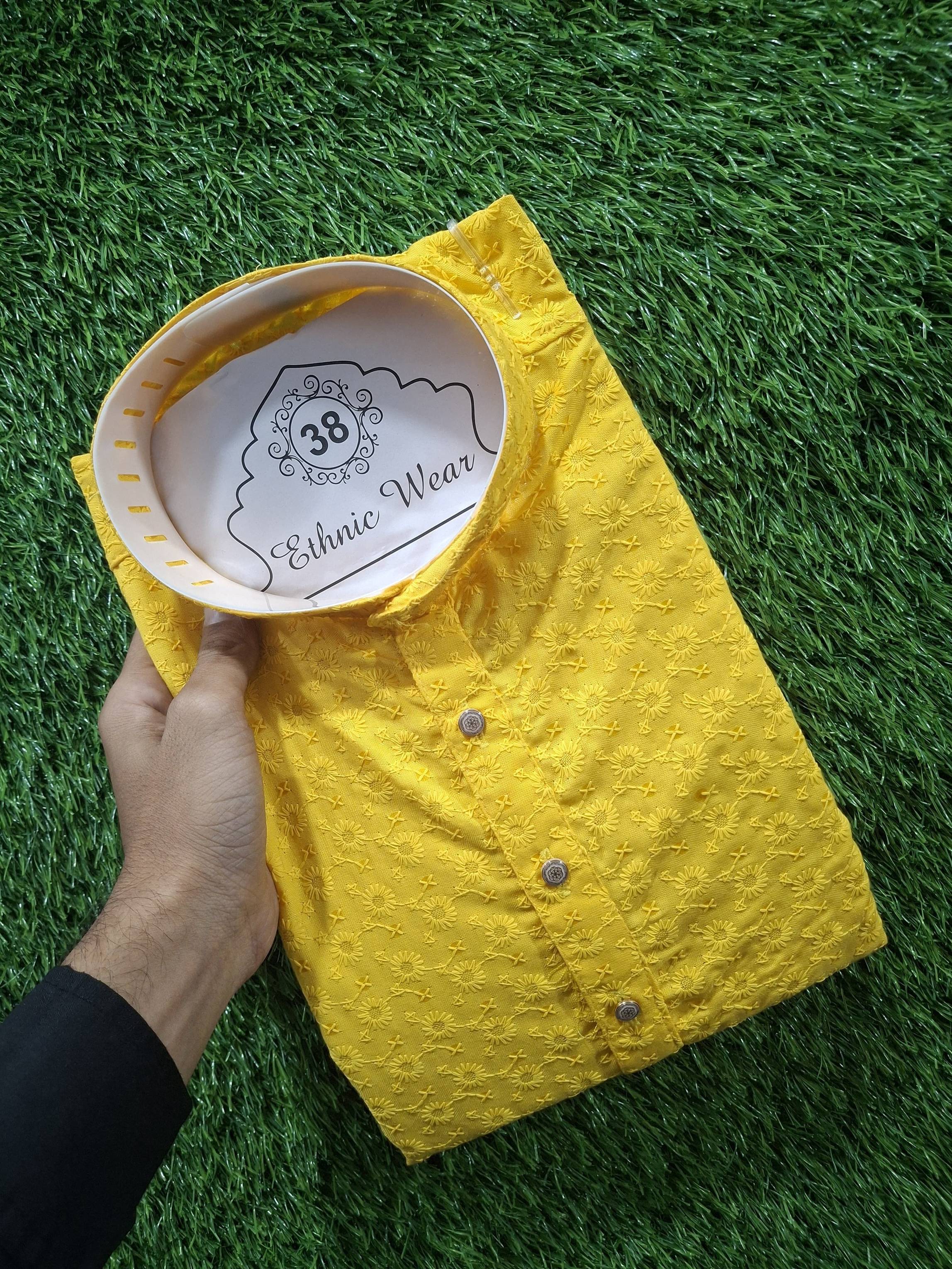 Elevate your ethnic wardrobe with our stunning Chikan Embroidered Work Kurta Set, designed for the modern individual who appreciates tradition. Made from viscose rayon fabric, this kurta features exquisite chikan embroidery that adds a touch of elegance to your ensemble. The mandarin collar and button-down front create a sophisticated silhouette, while the full sleeves and side slits ensure comfort and style. With two convenient pockets, this kurta is as practical as it is fashionable. Paired with crisp white pants, this set is perfect for festive occasions or casual gatherings, making it a versatile addition to your collection.