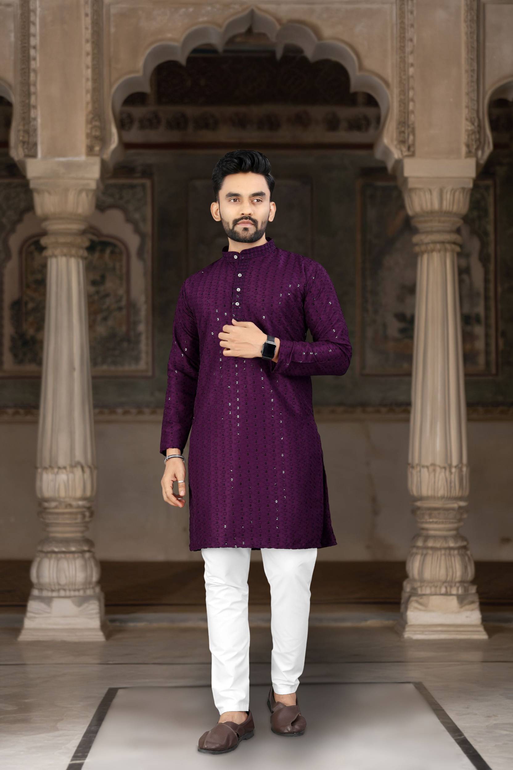 Enhance your festive wardrobe with this men’s kurta with pant set, perfect for weddings, pujas, and festive occasions. The wine-colored kurta, made from soft viscose rayon, features all-over sequins and embroidery that gives it a rich ethnic look. Designed with a mandarin collar, regular full sleeves, knee-length fit, and 2 pockets, it is paired with white cotton blend pants for all-day comfort. Ideal as a kurta pajama for men, kurta set for men, kurta pyjama for men, printed kurta for men, or kurta pant for men, this outfit is a perfect choice for men’s kurta for wedding, kurta pajama for men wedding, and kurta for men puja special.