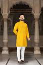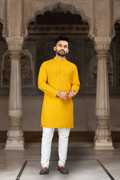 Brighten your festive look with this men’s kurta with pant set, ideal for weddings, pujas, and festive occasions. The yellow kurta, made from soft viscose rayon, features all-over sequins and embroidery for a rich ethnic appeal. Designed with a mandarin collar, regular full sleeves, knee-length fit, and 2 pockets, it is paired with white cotton blend pants for comfort and ease. Perfect as a kurta pajama for men, kurta set for men, kurta pyjama for men, printed kurta for men, or kurta pant for men, this outfit is an excellent choice for men’s kurta for wedding, kurta pajama for men wedding, and kurta for men puja special.