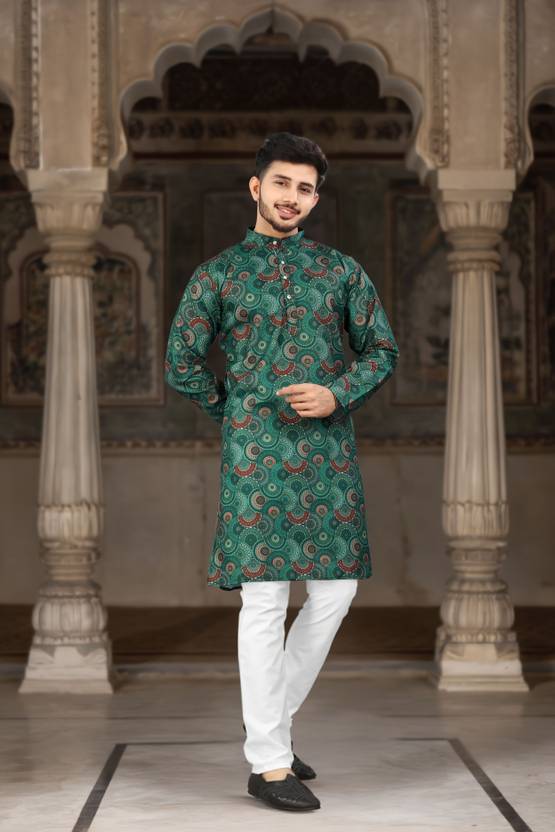 DHASU TRENDZ Men Printed Cotton Blend Straight Kurta (Green)