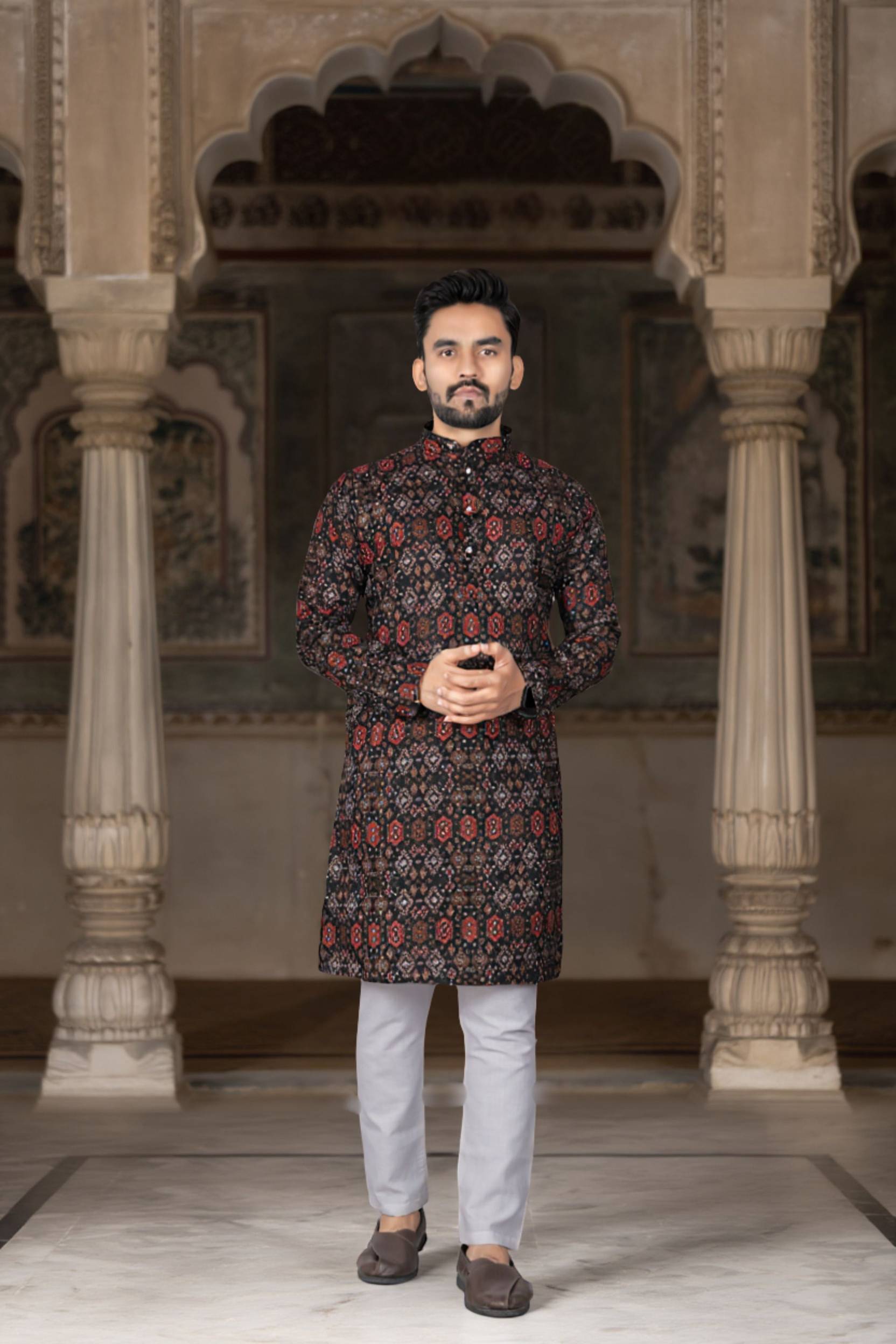 Rock the night in this printed kurta featuring elegant printed work that adds just the right amount of sparkle. Made from a soft cotton blend fabric, this kurta combines comfort with effortless style. Its vibrant coor shade and detailed print give a modern festive vibe, perfect for parties, celebrations, or casual outings. Pair it with dark jeans and sleek loafers to create a bold, confident look that’s sure to steal the spotlight wherever you go.