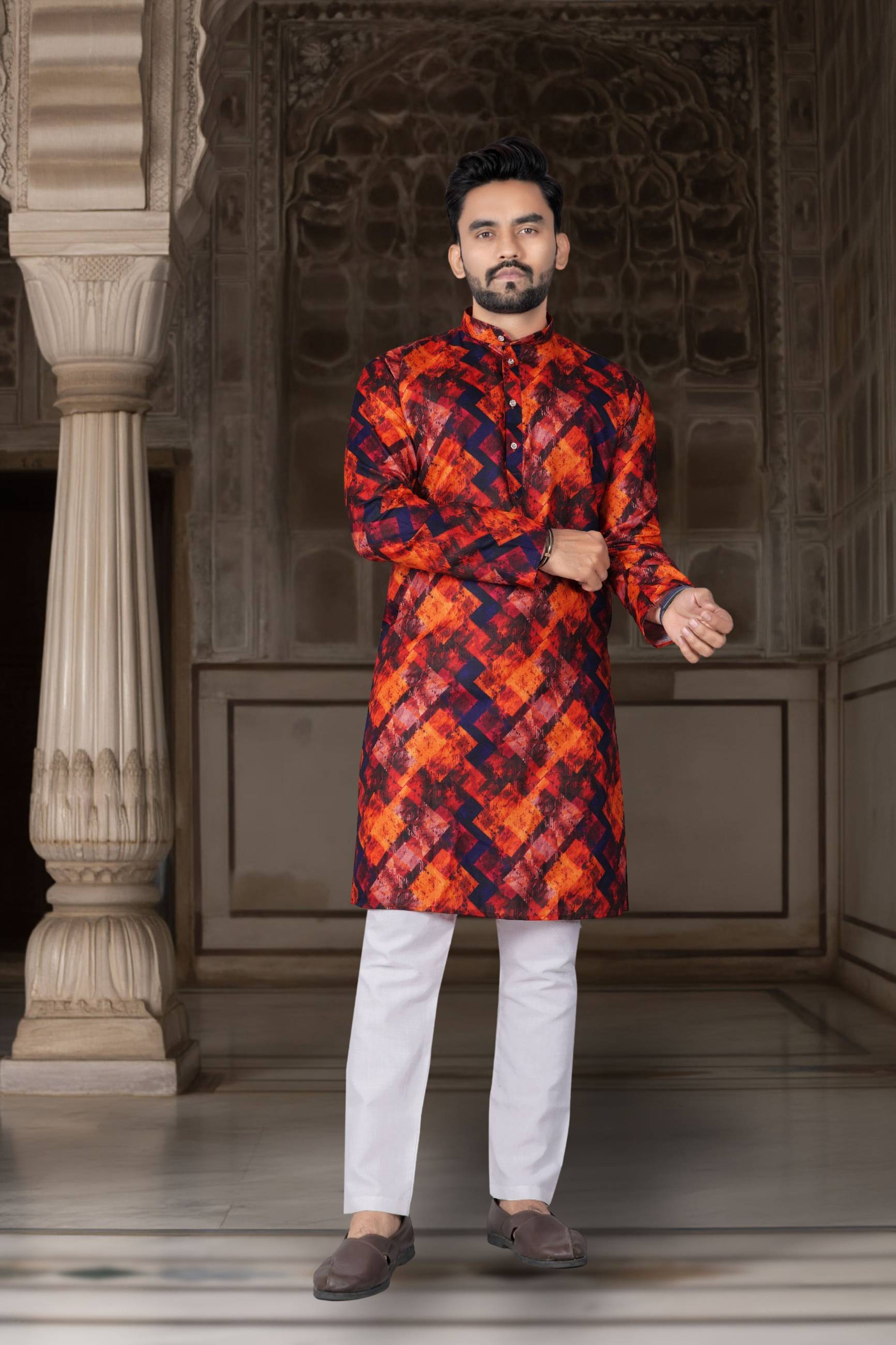 Rock the night in this printed kurta featuring elegant printed work that adds just the right amount of sparkle. Made from a soft cotton blend fabric, this kurta combines comfort with effortless style. Its vibrant coor shade and detailed print give a modern festive vibe, perfect for parties, celebrations, or casual outings. Pair it with dark jeans and sleek loafers to create a bold, confident look that’s sure to steal the spotlight wherever you go.