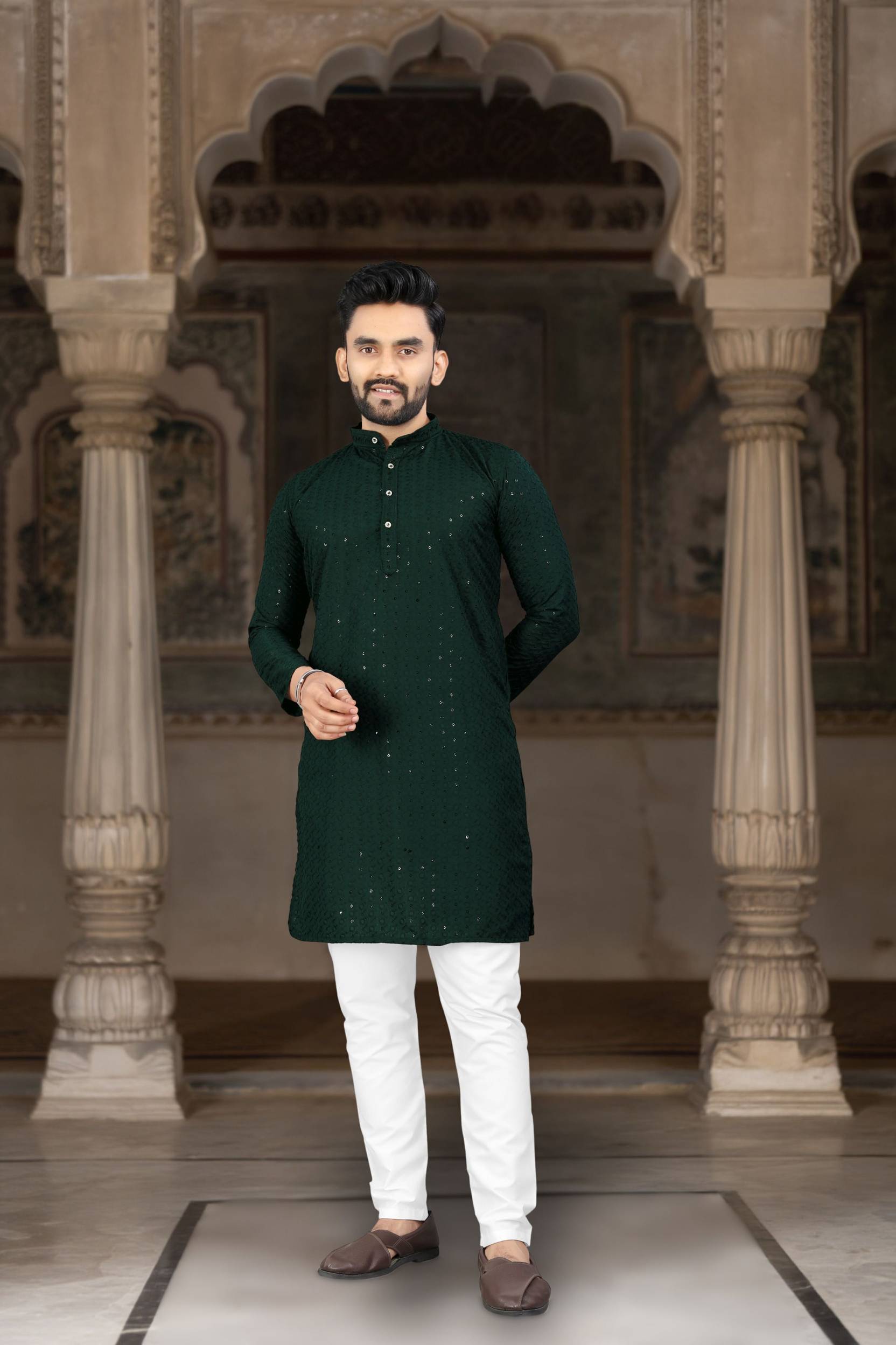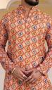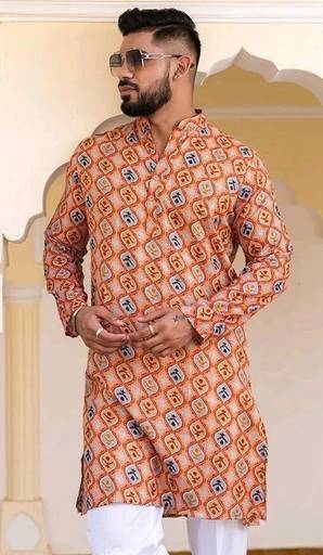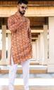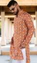 This men’s orange kurta is made from a comfortable cotton blend fabric and features an ethnic motif print that suits traditional and festive occasions. Designed with a mandarin collar, regular full sleeves, and a knee-length cut, this printed kurta for men offers ease of wear for weddings, puja ceremonies, and cultural functions. Two functional side pockets add everyday convenience while keeping the look neat and traditional. Suitable as a kurta for men cotton wear, this style works well as a wedding kurta for men, puja special kurta, or classic ethnic option for regular traditional use.