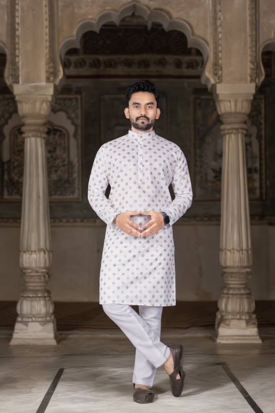 DHASU TRENDZ Men Printed Cotton Blend Straight Kurta (White)
