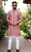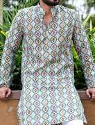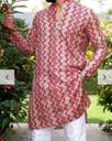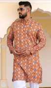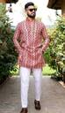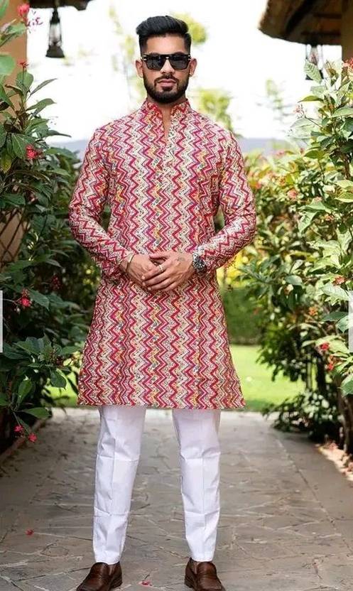 This men’s single kurta is made from comfortable cotton blend fabric, suitable for long hours of wear during festive and traditional occasions. Styled in a soft pink color, it features a beautiful geometric print that adds visual appeal while keeping a traditional look. The kurta is designed with a mandarin collar, regular full sleeves, and a knee-length fit, offering a neat and balanced appearance. Added two functional pockets provide everyday convenience. Ideal as a printed kurta for men, this style is well suited for kurta for men cotton, kurta for men for wedding, men’s kurta for wedding, wedding kurta for men, and kurta for men puja special. It can also be worn simply as a plain kurta for men or paired to form a solid kurta set for men, making it a versatile ethnic wear option.