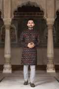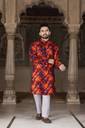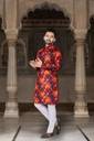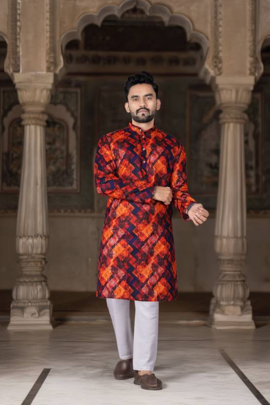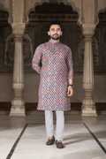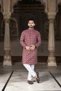 This kurta for men is made from comfortable cotton blend fabric, making it suitable for extended wear during festive and traditional occasions. Designed in a rich maroon color, this printed kurta for men features an all-over ethnic motif print that adds a traditional touch. The kurta is styled with a mandarin collar, regular full sleeves, and a knee-length cut, offering a balanced ethnic look. Equipped with two functional pockets, it provides everyday convenience along with traditional styling. Ideal as a kurta for men for wedding, puja special kurta, and festive gatherings, this mens kurta for wedding pairs well with pajama or churidar for a complete ethnic outfit.