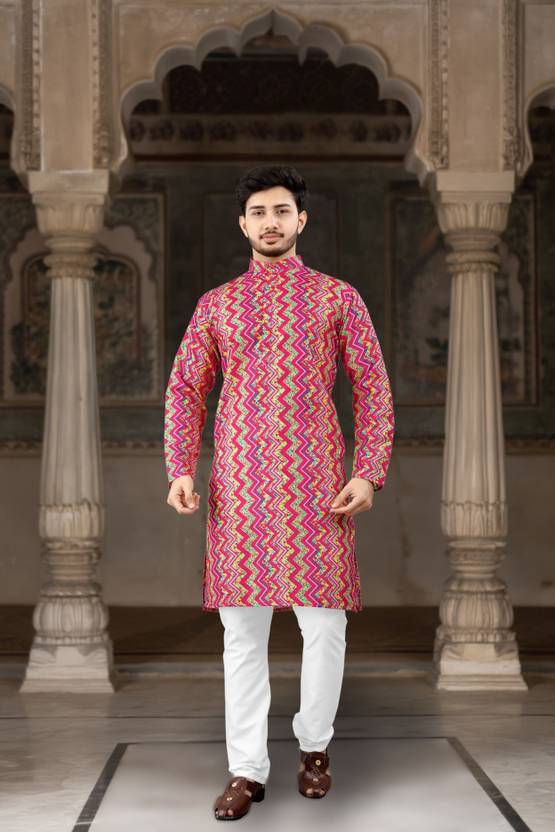 This kurta for men is made from comfortable cotton blend fabric and comes in a stylish pink color, making it suitable for festive, traditional, and occasional wear. The geometric print adds a modern ethnic touch, making this kurta a suitable choice for weddings and puja occasions. Designed with a mandarin collar, regular full sleeves, and a knee-length fit, it offers a balanced traditional look with everyday comfort. The kurta is designed with 2 functional pockets, adding convenience during wear. Ideal as a kurta for men for wedding, mens kurta for wedding, wedding kurta for men, and kurta for men puja special, this design also fits searches for printed kurta for men, solid kurta set for men, and plain kurta for men, making it suitable for multiple occasions.